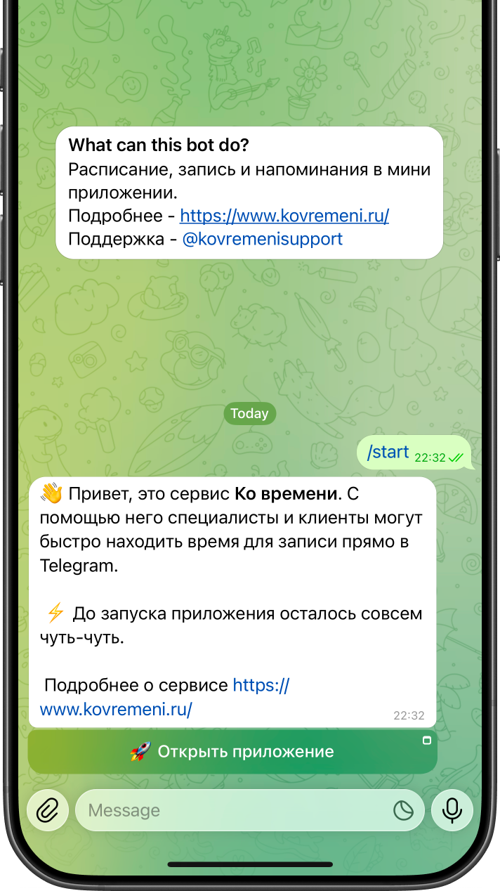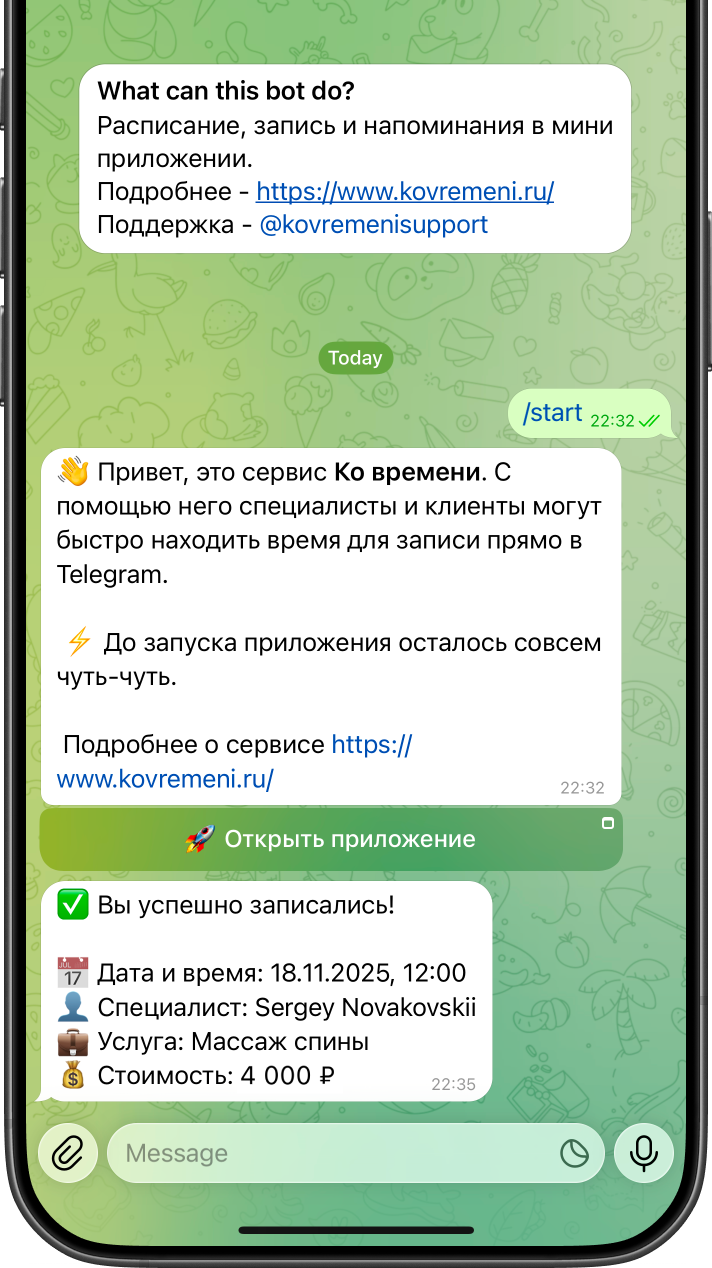 Всё работает прямо в Telegram. Ни мастеру, ни клиенту не нужно ставить отдельное приложение.